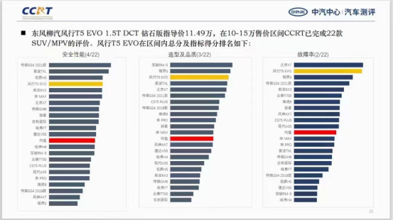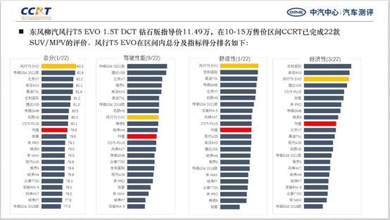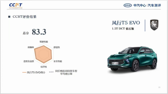 近日,中国汽车消费者研究及测试中心(CCRT)测评成绩出炉,经汽车测评管理中心审核,完成全部试验测试的东风风行T5 EVO,以83.3分的综合得分,位列22款自主品牌第一,这是继斩获2021世界智能驾驶挑战赛“驾驶辅助赛”组别冠军和拿下C-NCAP五星安全评价后,风行T5 EVO再次站在高光下。