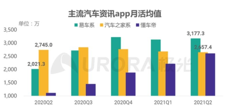 极光数据显示,易车APP自2018年11月份开始,DAU及MAU同比连续增长33个月。同时,极光发布的《2021年Q2移动互联网行业数据研究报告》,在主流汽车资讯app中,易车系应用Q2月活用户较去年同期增长迅猛,MAU均值达3177.3万,同比增幅为57.2%,自2020年Q4以来成为行业的第一名。