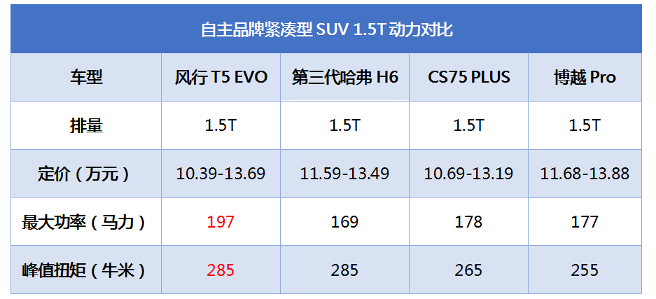 自主品牌紧凑型SUV 1.5T动力对比