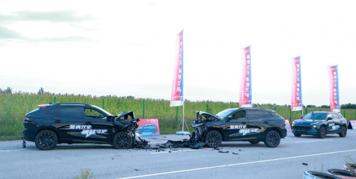 在测试现场中,风行T5 EVO还进行了双车碰撞测试。值得注意的是,双车对撞所产生的碰撞效果与伤害远高于单车碰撞,且撞击侧全部位于双车驾驶侧,严苛试验条件对风行T5 EVO的车身结构设计、约束系统匹配、制造工艺等提出了全新的挑战。在实际测试中,两辆风行T5 EVO以100km/h的相对速度高速对撞,经过碰撞后,风行T5 EVO的A/B/C柱结构无变形,前排驾驶员和副驾驶员侧车门均可正常打开,舱内气囊正常弹出,展现出优异的被动安全性能。相较于采用刚性墙或可变形壁障的标准工况,双车对撞更加真实再现了日常生活中的车辆交通事故,最大程度验证了风行T5 EVO对用户的五星安全保护。
