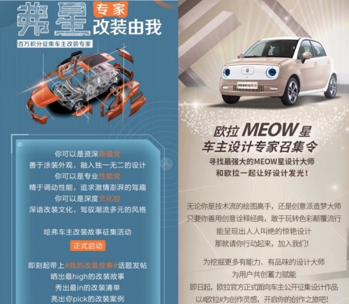 紧贴车主用车场景,长城汽车推出一系列车主专家活动。今年6月,哈弗百万积分征集车主改装专家活动成功点燃车辆改装爱好者的热情;10月欧拉的“MEOW星”车主设计大赛邀请用户共话设计美学,也在用户中获得了极高的赞誉和强烈的反响,为长城汽车的用户共创进一步蓄力赋能。