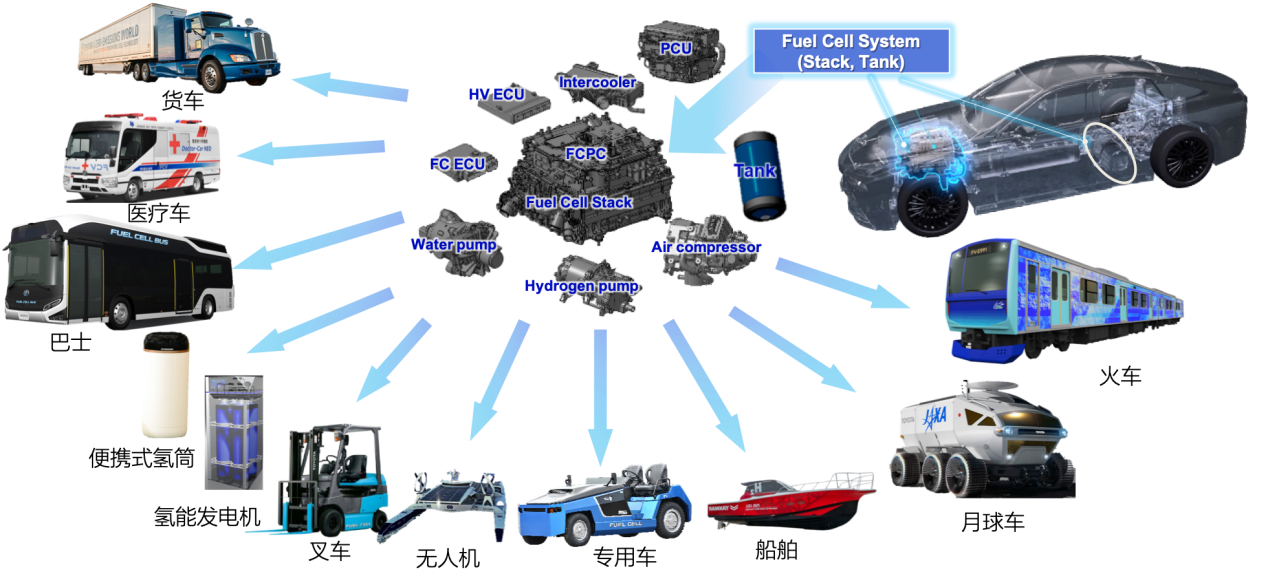 到目前为止,丰田已将氢能应用在了巴士、卡车、叉车等商用车领域,甚至还有便携式氢筒,氢能发电机等,可以说氢能的应用已经延伸到了各个领域。在氢能领域的合作伙伴也覆盖了整车制造、FC(燃料电池)系统集成/生产/销售、车辆运营使用以及制氢、储氢、运氢等全产业链上下游。