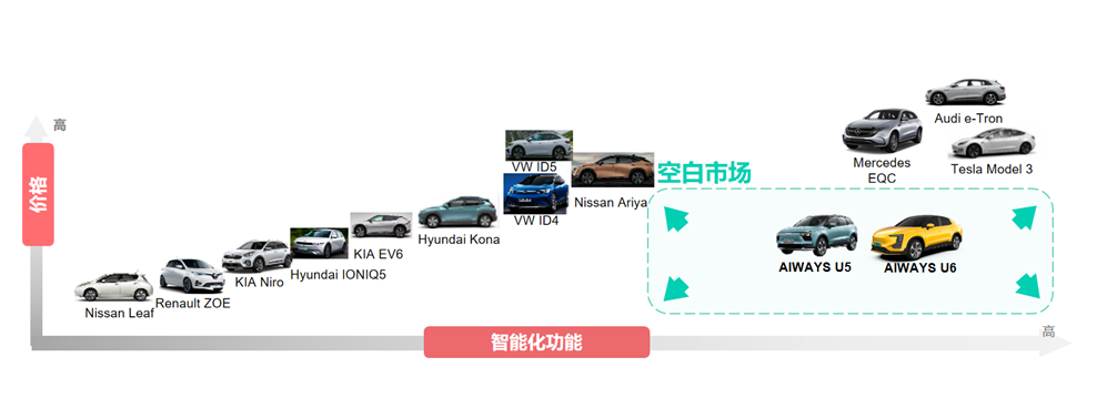 早在2020年,定位中高端智能纯电SUV的欧版爱驰U5便以高达4.5万欧元的售价进军全球最难攻破的欧盟市场,而彼时的欧洲电动车市场呈现两极分化趋势,消费者要么选择尺寸比爱驰U5小但价格更贵的特斯拉Model 3、奥迪E-tron、奔驰EQC等车型,要么牺牲车内空间和品质感,选择雷诺ZOE、现代Kona等小型/紧凑型车。并且,这两类车型和中国车相比,智能化程度普遍更差。爱驰U5凭借价格适中、空间大、智能化体验等优势填补了欧洲智能纯电中型SUV细分市场的空白,成为欧洲消费者心目中买得起、用得省、开得爽、坐得下的首选车型。