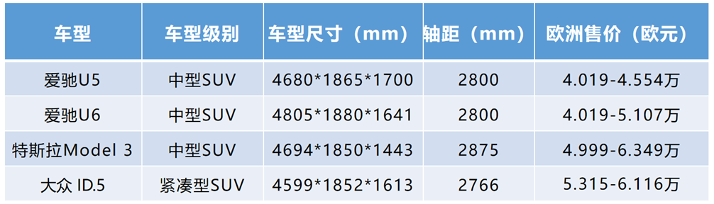 和爱驰U6同时期的智能电动车品类相比,大众ID.5、特斯拉Model 3其空间和价格优势都略逊于U6。从尺寸来看,欧版爱驰U6的车身尺寸为4805x1880x1641mm,轴距达到2800mm;大众ID.5车身尺寸为4599x1852x1613mm,轴距为2766mm;特斯拉Model 3虽然轴距比爱驰U5、U6略长,但整车尺寸为4694x1850x1443mm,相比爱驰U5、U6缺乏尺寸上的优势。仅从参数来看,欧版爱驰U6整车尺寸优于大众ID.5和特斯拉Model 3,这也意味着爱驰U6的大空间能够为用户提供更好的舒适性。从售价上来看,大众ID.5欧洲售价高达6.1万欧元;特斯拉Model 3欧洲售价高达6.3万欧元。综合对比来看,欧版爱驰U6完全能够以更具性价比的价格让用户享受更高品质的用车体验。