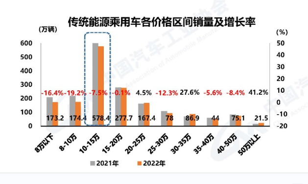 中汽协发布的数据显示,2022年,我国传统燃油乘用车中,主要销量贡献集中在10-15万元,累计销量578.4万辆;新能源乘用车中,主要销量贡献集中在15-20万元,累计销量185.5万辆。
