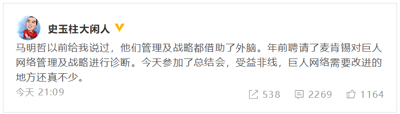 马明哲以前给我说过,他们管理及战略都借助了外脑。年前聘请了麦肯锡对巨人网络管理及战略进行诊断。今天参加了总结会,受益非线,巨人网络需要改进的地方还真不少。
