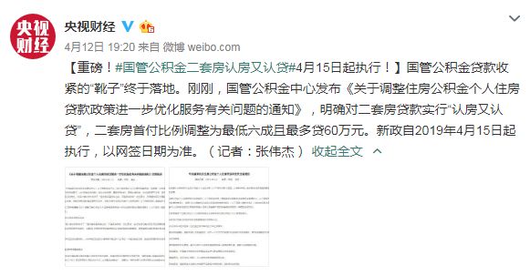 【经东网财经消息】近日,来自央视微博的消息显示,4月12日,北京国管公积金中心发布《关于调整住房公积金个人住房贷款政策进一步优化服务有关问题的通知》,明确对二套房贷款实行“认房又认贷”,二套房首付比例调整为最低六成,且最多贷60万元。新政自2019年4月15日起执行,以网签日期为准。
