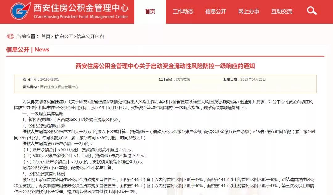【经东网财经消息】前天(4月23日),陕西省西安市住房公积金管理中心发布通知《西安住房公积金管理中心关于启动资金流动性风险防控一级响应的通知》,通知显示从2019年5月13日起,实施资金流动性风险防控一级响应措施。