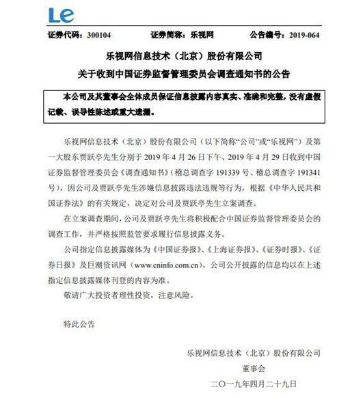 【经东网财经消息】昨日(2019年4月29日)晚间,乐视网信息技术(北京)股份有限公司发布公告称,公司及第一大股东贾跃亭分别于2019年4月26日下午、2019年4月29日收到中国证券监督管理委员会《调查通知书》(稽总调查字191339号、稽总调查字191341号),因公司及贾跃亭涉嫌信息披露违法违规等行为,根据《中华人民共和国证券法》的有关规定,决定对公司及贾跃亭立案调查。