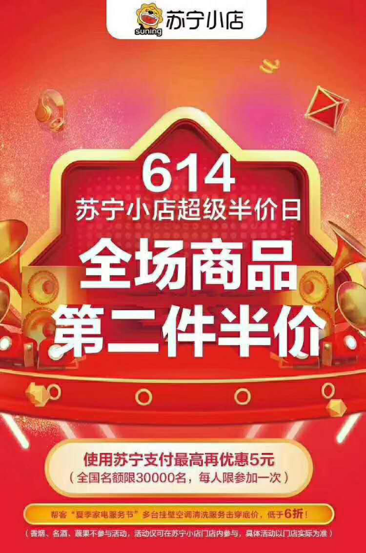 这些必备品在哪里购买合适呢?贴心的苏宁小店早已为你安排的明明白白,6月14日,全国苏宁小店全场购买任意两件商品,低单价商品可享受五折优惠(全场商品第二件半价),当天使用苏宁支付还可享受折上折,最高再优惠5元。