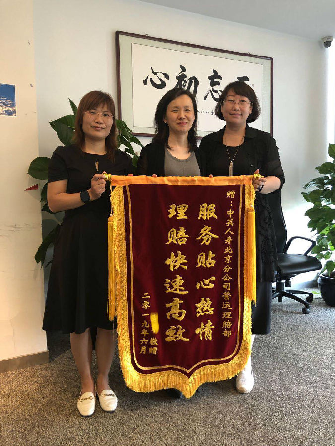 北京分公司高效、优质而贴心的服务得到了客户的高度认可。在无情的疾病面前,中英人寿带给客户的关爱,深深感动了客户。6月17日,马先生及其家人为中英人寿北京分公司送来了锦旗,并对中英人寿工作人员的认真负责的工作态度及中英的高效理赔的工作效率给予了高度评价,同时对中英给他带来的温暖及关爱表达了感谢。