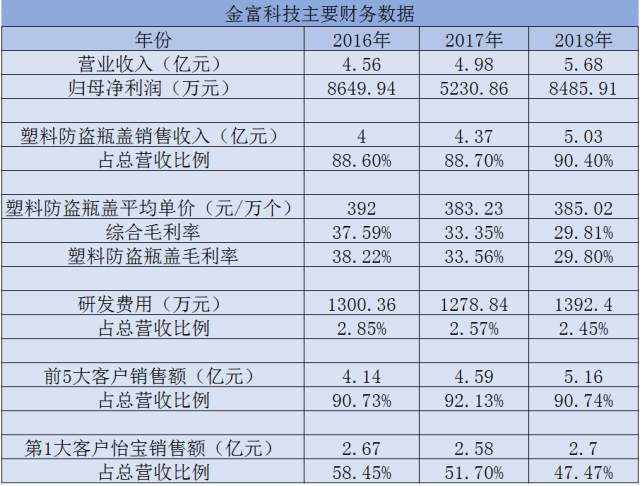 而通过查阅金富科技的招股书,编辑发现,金富科技公司业务较为单一,近九成业绩都是来自卖“塑料防盗瓶盖”,而这些会让金富科技难以抵抗原材料价格上涨的压力,因此金富科技近年来毛利率也持续下滑。