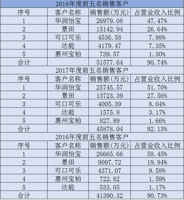 金富科技招股书显示,2016年-2018年,金富科技前五大客户分别为华润怡宝、景田、可口可乐、达能和惠州宝柏,合计销售金额分别为4.14亿元、4.59亿元和5.16亿元,占营业收入的比例分别为90.73%、92.13%和90.74%。而金富科技的这五大客户中,怡宝重中之重。资料显示,2016年-2018年,金富科技对华润怡宝的销售收入分别为2.67亿元、2.58亿元和2.7亿元,占营业收入的比例分别为58.45%、51.70%和47.47%。由此看来,富科技存在客户集中度较高的风险,并且过度依赖单一客户。