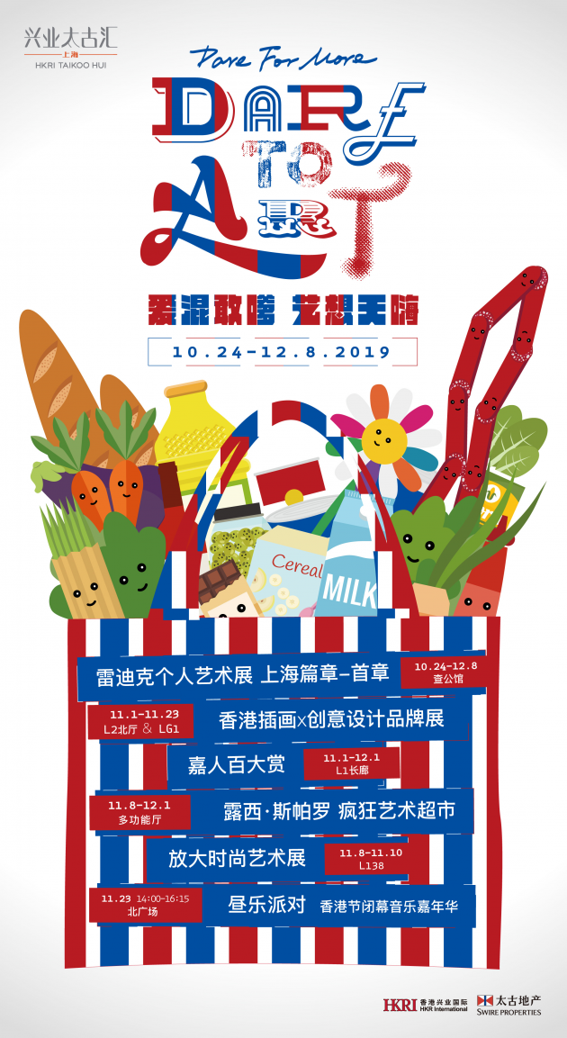 2019年10月24日-12月8日,兴业太古汇迎来崭新艺术季,围绕“Dare For More Dare To Art 爱混敢嗲·艺想天嗨”主题,与香港特区政府、嘉人、木木美术馆、美国艺术家雷迪克(Redic)亲密合作,通过插画品牌展、户外音乐会及各式特色展览等丰富活动,打造艺术文化与商业和谐共生的“灵感之境”。