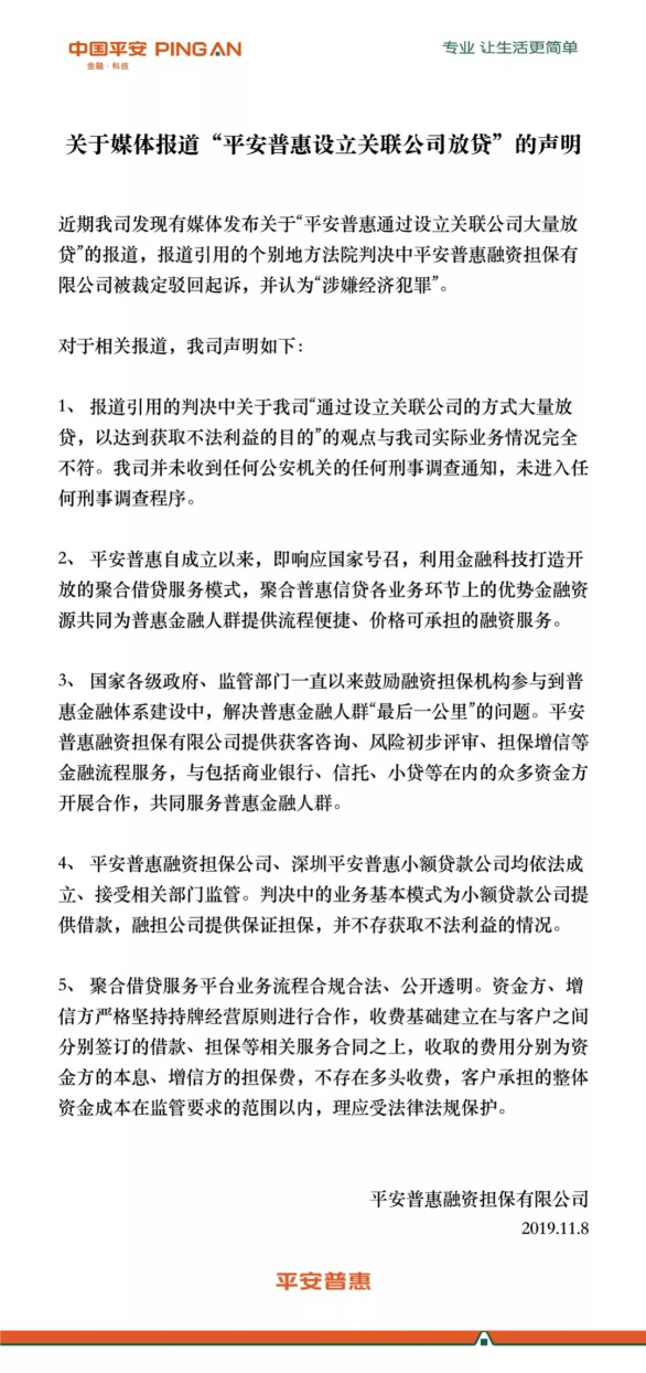 的公开声明的消息引发媒体热议。查阅近期的相关资讯发现,原来该声明是针对近期“江苏省徐州市中级人民法院的一份民事裁定引发了媒体对平安普惠融资担保有限公司涉嫌经济犯罪的关注”的回应。《关于媒体报道“平安普惠设立关联公司放贷”的声明》称“法院判决中关于平安普惠“通过设立关联公司的方式大量放贷,以达到获取不法利益的目的”观点与实际业务完全不符,平安普惠未收到任何公安机关的刑事调查通知,未进入任何刑事调查程序。”