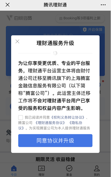 腾讯理财通平台运营主体近日变更,由财付通公司迁移至上海腾富金融信息服务有限公司(以下简称“腾富公司”)。运营主体迁移是为了让用户享受更专业、更优质的理财服务,将不会对腾讯理财通用户服务权益产生影响。