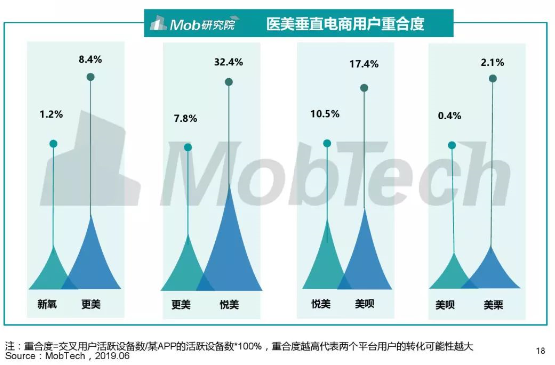 在用户重合度方面,新氧依然有很大的优势。根据MOB研究院数据,下图中数值越高代表两个平台之间的用户转化的可能性越大。新氧在用户基数远大于其它公司的同时,用户重合度也最低。