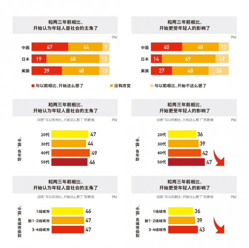 为了探寻与深挖生活者的年轻化意识,博报堂生活综研(上海)在中国、日本、美国实施了大规模的多样化调查——“年轻化意识调查2019”;在北京、上海、广州等6个城市开展了“年轻化生活者访谈”;同时还分别开展了“专家访谈”和“我所热衷的事物”照片收集分析。成果显示,中国生活者整体都在积极接受着年轻一代所给予他们的影响。