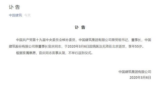 中国共产党第十九届中央委员会候补委员,中国建筑集团有限公司原党组书记、董事长,中国建筑股份有限公司原董事长官庆同志,于2020年3月6日因病医治无效在北京逝世,享年55岁。根据家属意愿,官庆同志丧事从简,不举行送别仪式。