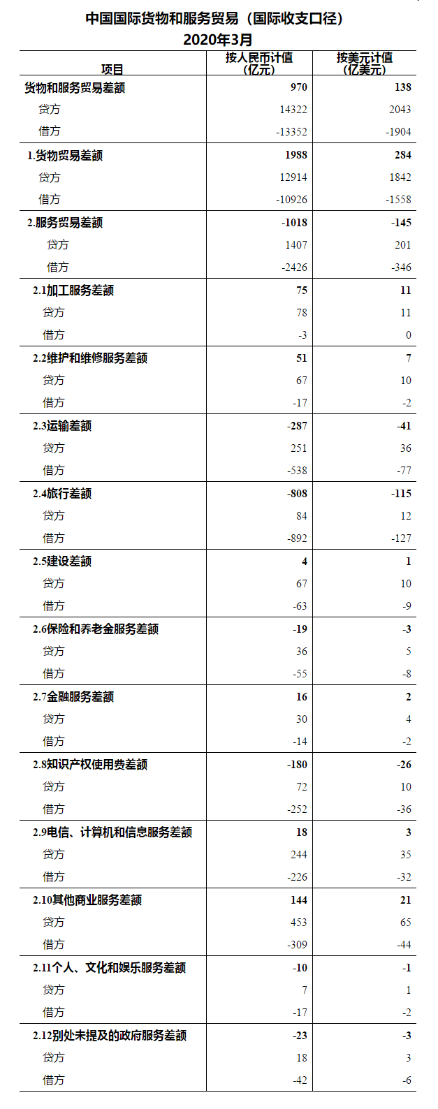 2020年3月,我国国际收支口径的国际货物和服务贸易收入14322亿元,支出13352亿元,顺差970亿元。其中,货物贸易收入12914亿元,支出10926亿元,顺差1988亿元;服务贸易收入1407亿元,支出2426亿元,逆差1018亿元。