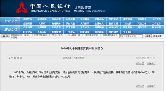 2020年7月,为维护银行体系流动性合理充裕,结合金融机构流动性需求,人民银行对金融机构开展中期借贷便利操作共4000亿元,期限1年,利率为2.95%。期末中期借贷便利余额为35500亿元。
