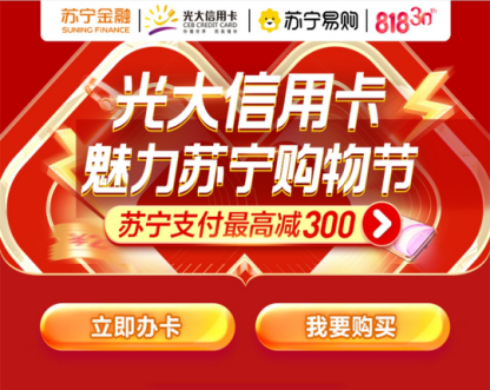 据了解,今年是苏宁与光大银行战略合作1周年。818期间,双方联合推出重磅福利:用苏宁支付绑光大信用卡购买指定家电3C产品最高立减300元,在线上线下多场景送千万优惠。