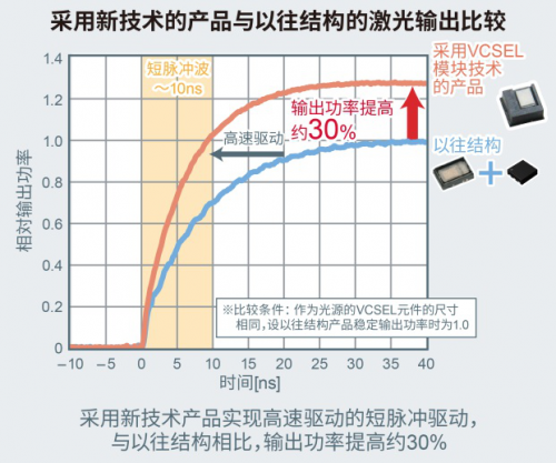 ROHM此项新技术的确立,将新VCSEL元件和MOSFET元件集成于1个模块封装中,通过尽量缩短元件间的布线长度,能更大程度地发挥出各元件的性能,且不易受阳光带来的外部干扰影响。同时实现了短脉冲(10纳秒以内)驱动,以及高于以往产品约30%的输出功率。
