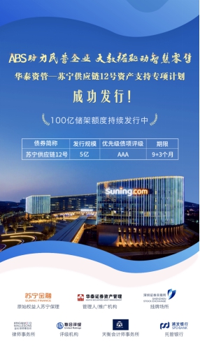 9月18日,由苏宁保理作为原始权益人、苏宁金融作为差额补足方的供应链ABS产品“华泰资管-苏宁供应链12号资产支持专项计划”在深圳证券交易所成功发行,发行规模5亿元,再次表明资本市场对苏宁金融的认可。这是苏宁金融发行的第九期供应链资产支持专项计划,累计发行规模已超90亿元。