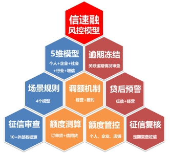 据了解,“信速融”数据风控模型在5月底全面迭代,基于海量内外部大数据,先进的风控算法模型,运用五大维度数据,研发完整小微智能风控模型体系,为小微信用贷款产品“保驾护航”。