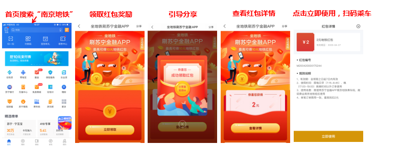 活动期间,登录苏宁金融APP,首页搜索“南京地铁”,即可进入活动页。新用户当日首次登录,可免费领取10元地铁新人礼包(1张4元,2张2元,2张1元);老用户可领取1张2元红包。新人礼包限领取1次,老用户奖励每天均可领取1次,最多可领5次。领取红包后,7天内使用苏宁金融APP乘车码,就可以扫码优惠乘南京地铁了。