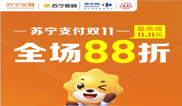 此次双十一,苏宁支付将在家乐福门店发放88折支付券,最高减11.11元。领券时间为11月1日至5日,用券时间为11月6日至11日。单个用户限领取一张,扫描家乐福门店物料上的二维码即可参与活动。