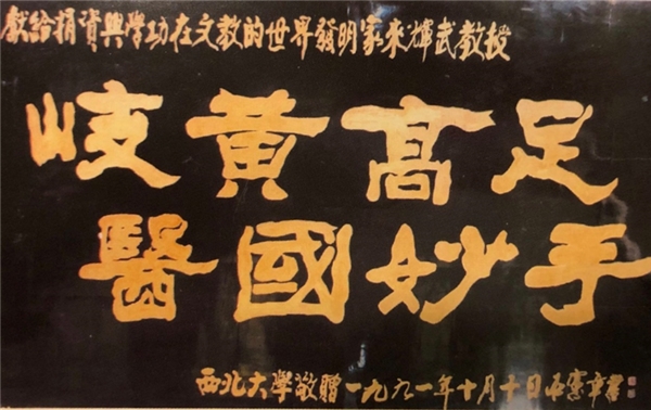 为了感谢来总裁对社会公益事业的巨大奉献,西北大学校长及专家教授、教师,精心酝酿“岐黄高足,医国妙手”,表达对505来总裁的崇高敬意,并请著名的书法家书写后,雕刻成金字牌匾,专程郑重向来总裁敬赠,并举行隆重的赠匾仪式,会场内外洋溢着热烈喜庆的气氛,匾额上“岐黄高足 医国妙手”八个金黄色的大字格外醒目,各方来宾报以热烈的掌声,505的新老朋友、社会各界人士共同见证了这一难忘的时刻。