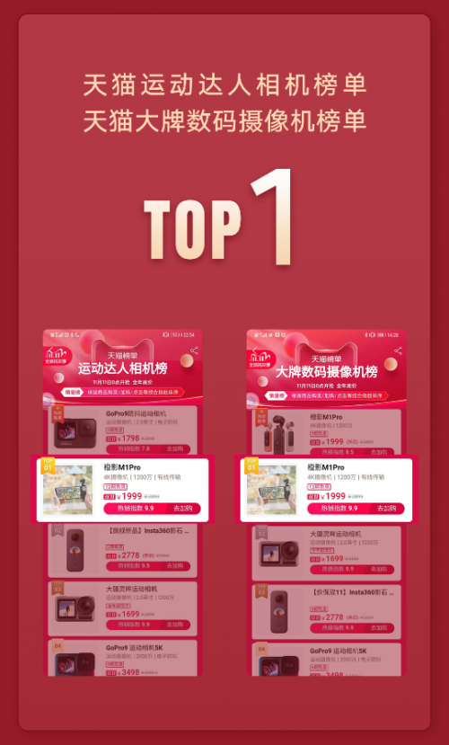11月11日,新锐智能摄影机品牌,有着“vlog神器”之称的橙影发布了产品问世以来首个双十一的营销战报。数据显示,仅用5分35秒,其全网GMV便已超过618全天,前一小时累计销售超过3500台,其销量在天猫运动达人相机榜单和天猫大牌数码摄像机榜单中双双名列第一,在天猫单品行业排名中也雄踞首位。