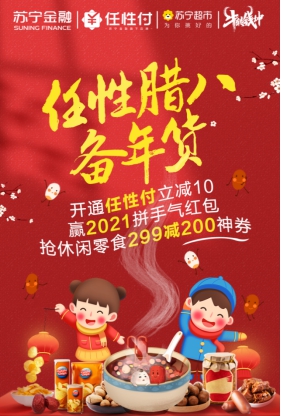 今天是腊八节,“过了腊八就是年”,意味着过年已经拉开序幕啦!你的年货都准备好了吗?苏宁任性付助力“年货节”,新开通用户立减10元,拼2021元牛气红包,更有休闲食品满299元减200元神券等你抢,红红火火迎新年。