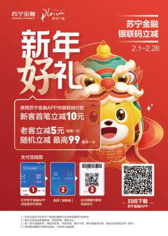 活动期间,在苏宁广场部分指定银联云闪付受理商户,使用苏宁金融APP银联码付款,新用户可享立减10元优惠;老用户每周享受一次满5元减5元,且还可享受每日一次随机立减,最高立减99元。