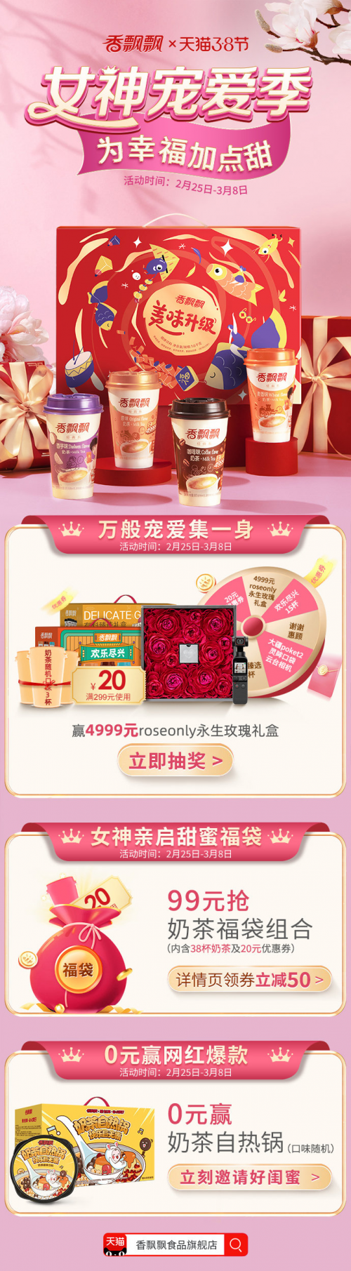 这次女神节,香飘飘和天猫3·8节一起给大家带来了超多惊喜,诚意满满。