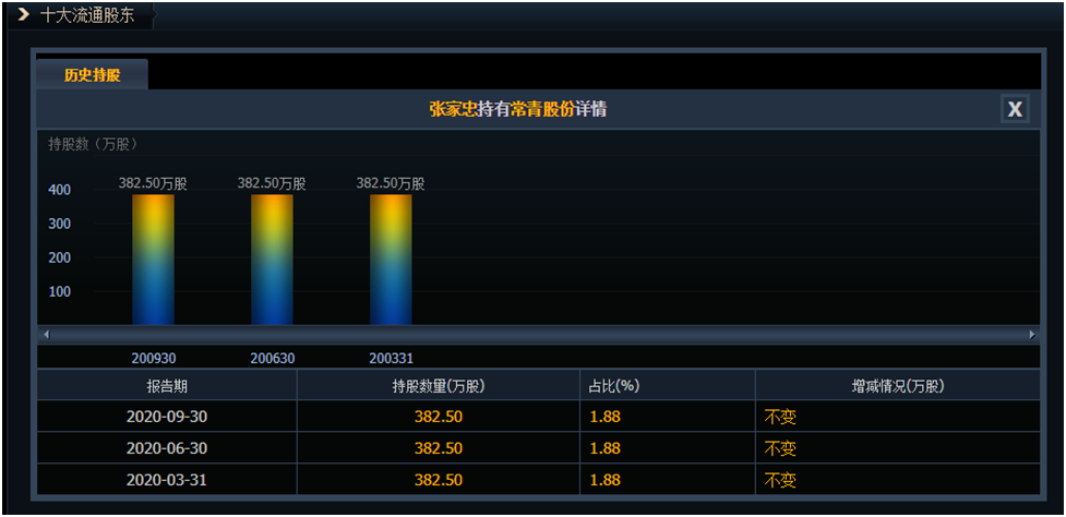 截至2020年9月底持股情况账户资产水涨船高,持股情况603768常青股份382.50万股。