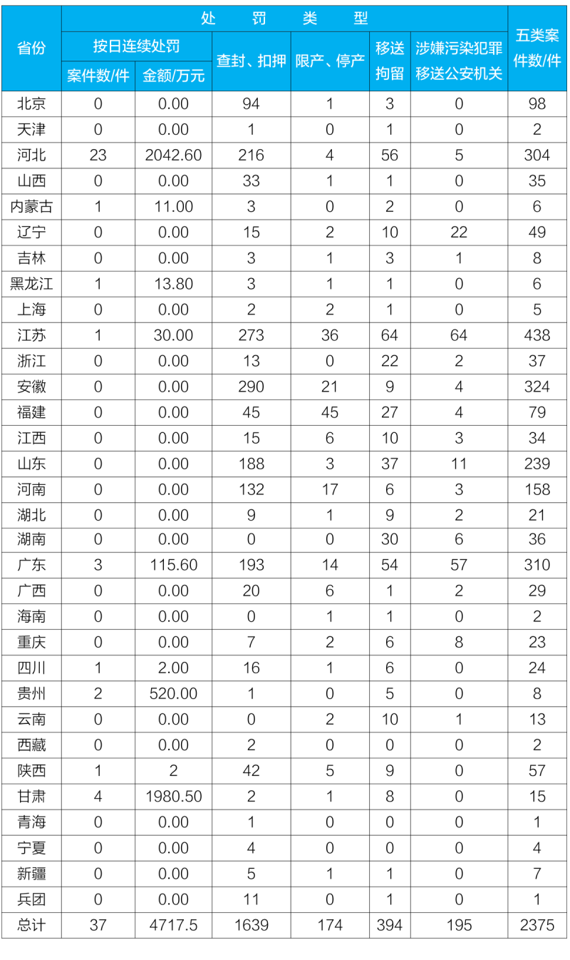 2021年1-3月,全国五类案件总数为2375件,其中,按日连续处罚案件数量为37件,罚款金额为4717.50万元;适用查封、扣押案件数量为1639件;适用限产、停产案件数量为174件;移送拘留案件数量为394件;移送涉嫌环境污染犯罪案件数量为195件。