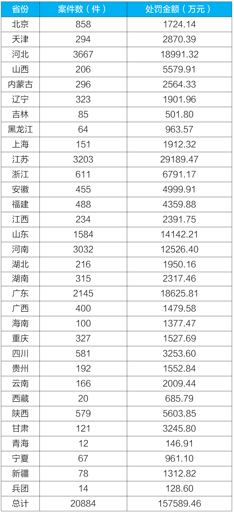 2021年1-3月,行政处罚案件数量排名前五的省份为:河北、江苏、河南、广东、山东;罚款金额排名前五的省份为:江苏、河北、广东、山东、河南。