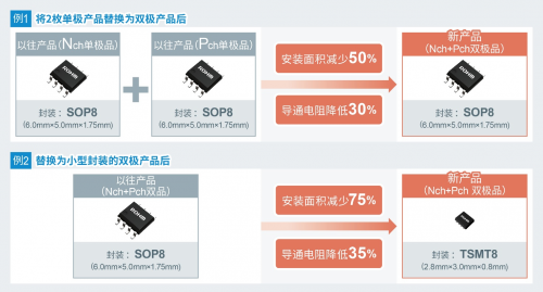 通过在一个封装中内置两枚器件,有助于设备的小型化和减少器件选型的时间。在小型化方面,如果将以往的Nch+Pch双极MOSFET(SOP8)替换成新产品(TSMT8),安装面积可减少75%。