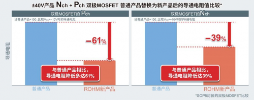 在ROHM此次开发的业界先进的双极MOSFET 中,采用了新工艺的、±40V耐压的产品与普通产品相比,Pch部分的导通电阻降低多达61%,Nch部分的导通电阻也降低达39%,有助于降低各种设备的功耗。