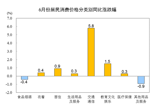 6月份,全国居民消费价格环比下降0.4%。其中,城市下降0.4%,农村下降0.5%;食品价格下降2.2%,非食品价格持平;消费品价格下降0.6%,服务价格下降0.1%。