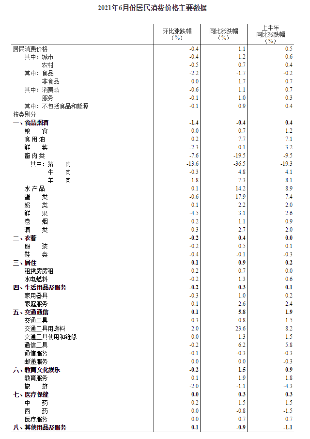 2021年6月份,全国居民消费价格同比上涨1.1%。其中,城市上涨1.2%,农村上涨0.7%;食品价格下降1.7%,非食品价格上涨1.7%;消费品价格上涨1.1%,服务价格上涨1.0%。上半年,全国居民消费价格比去年同期上涨0.5%。