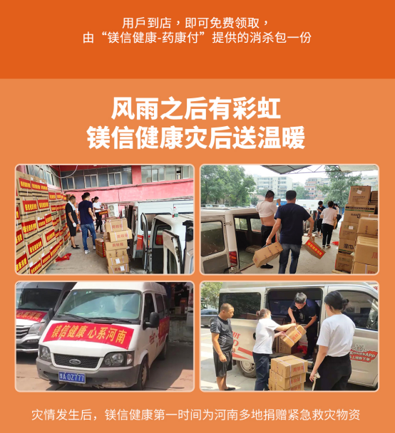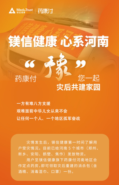 7月27日,镁信健康宣布向河南省郑州、新乡、安阳、鹤壁、焦作5个城市免费发放消杀物资。用户即日起至镁信健康旗下药康付河南地区合作定点药房,即可领取灾后重建的消杀包(含酒精、消毒湿巾、口罩)一份。