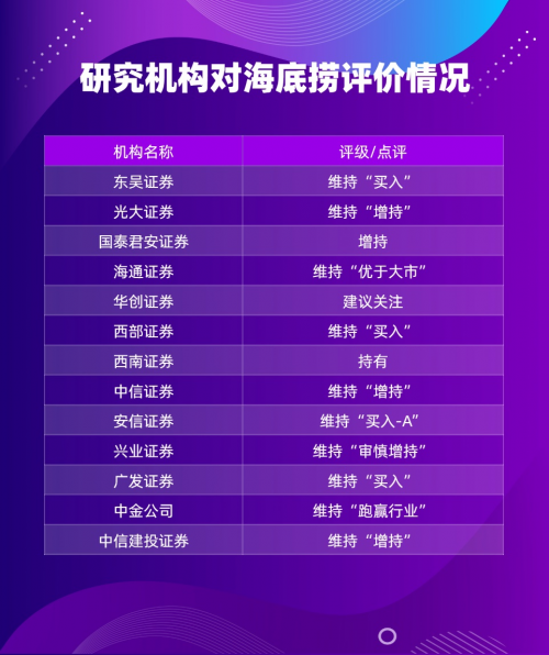 华创证券强调,海底捞在餐饮行业布局全面、基础建设领先、激励机制先进、品牌力强大,随着开店控速,考核方式变化等,海底捞业绩弹性较大,建议关注。