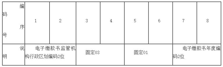电子缴款书代码设计为8位,由电子缴款书监管机构行政区划编码、电子缴款书分类编码、电子缴款书种类编码、电子缴款书年度编码4部分组成。