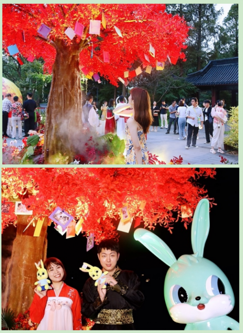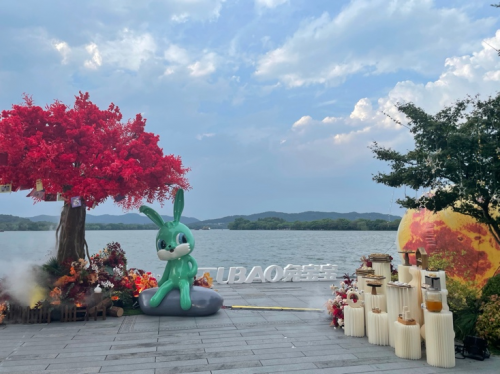 坐标公认绝佳赏月地杭州西湖,精心打造花前月下温馨之景,中秋夜化身“玉兔”的兔宝宝,以其可爱的亲和力吸引不少路人驻足合影留念,更有不少身着汉服追着“寻兔启事”线索前来打卡的年轻人,直呼“兔宝宝也太会了吧”“这竟然就是长辈口中的兔宝宝呀!”。兔宝宝为了更好地陪伴大家过中秋,还在现场准备了不少互动活动,月桂树下可以挂上照片寄情相思,打卡送出美好祝福还能获得精美的中秋礼品,现场环保材料制作的吧台上更是准备了各式月饼糕点。