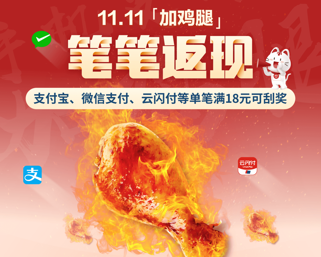 据了解,此次“加鸡腿”获取渠道极多,支付环境覆盖了当下消费生活所涉及的各类主流电商,包括支付宝、微信支付、云闪付、美团支付、京东支付、一网通支付等,用户可随时切换场景随时使用,无需改变支付习惯,在11.11购物狂欢结束后,还有半个多月的时间可继续“加鸡腿”。同时,此次“加鸡腿”活动中还增加了新玩法,可以一键连刮5次,再也不担心刮奖次数太多刮不完了!
