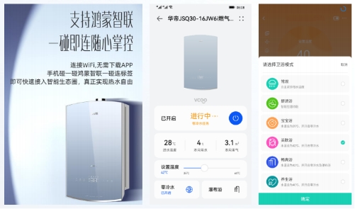 本次发布会上的另一大亮点,则是华帝最新燃热新品JW6i,该产品选择HarmonyOS Connect(鸿蒙智联)系统,能极简快速配网,其广泛的平台布局,可畅想多种场景。在HarmonyOS Connect的加持下,华帝JW6i为用户提供了极简交互、极简连接等全新智慧生活体验;同时搭载全新半程零冷水加热预热技术、变频增压瀑布浴技术、专利温控舱(实用新型专利:ZL201521085968.5)等多项功能,性能方面可谓亮点十足。