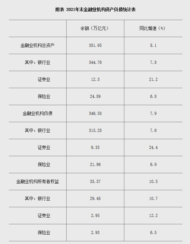 注1:金融业机构总资产、负债和所有者权益是银行业、证券业和保险业机构相应指标的汇总数。其中,银行业机构指法人金融机构(含境外分行),不包括中央银行;证券业机构包括证券公司、期货公司和基金公司,证券公司和期货公司总资产均包括自身及客户资产;保险业机构包括财产保险公司、人身保险公司、再保险公司、保险集团公司和保险资产管理公司。